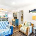 The Sandy Days Condo has 2 bedrooms. One bedroom holds a king sized bed and the other has a queen sized bed. Make use of the quaint kitchen and living area space.